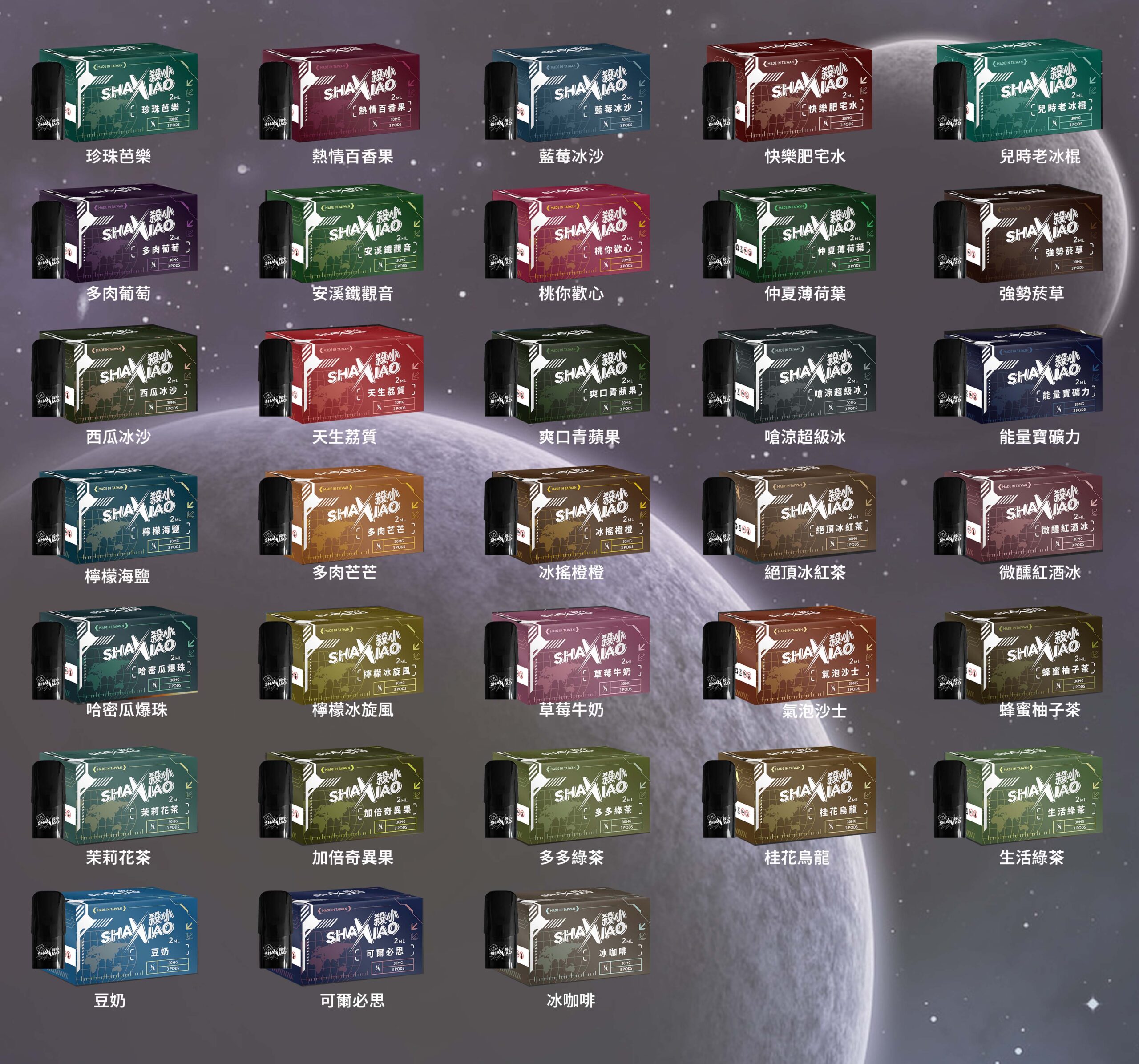 殺小煙彈口味. 仲夏薄荷葉, 冰咖啡, 冰搖橙冰, 可爾比思, 哈密瓜爆珠, 嗆涼超級冰, 多多綠茶, 多肉芒芒, 多肉葡萄, 天生荔枝, 奇異果, 安溪鐵觀音等口味。